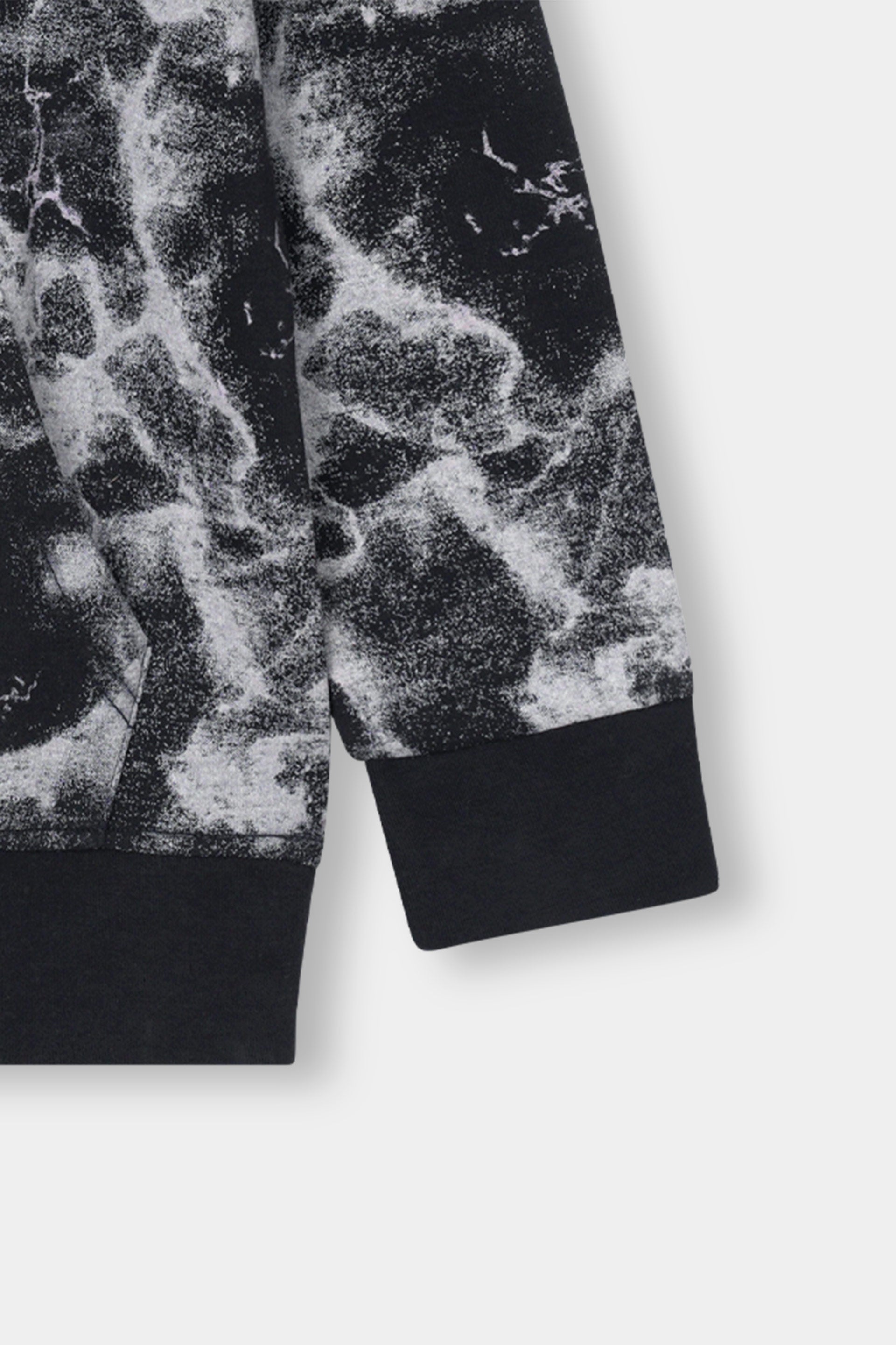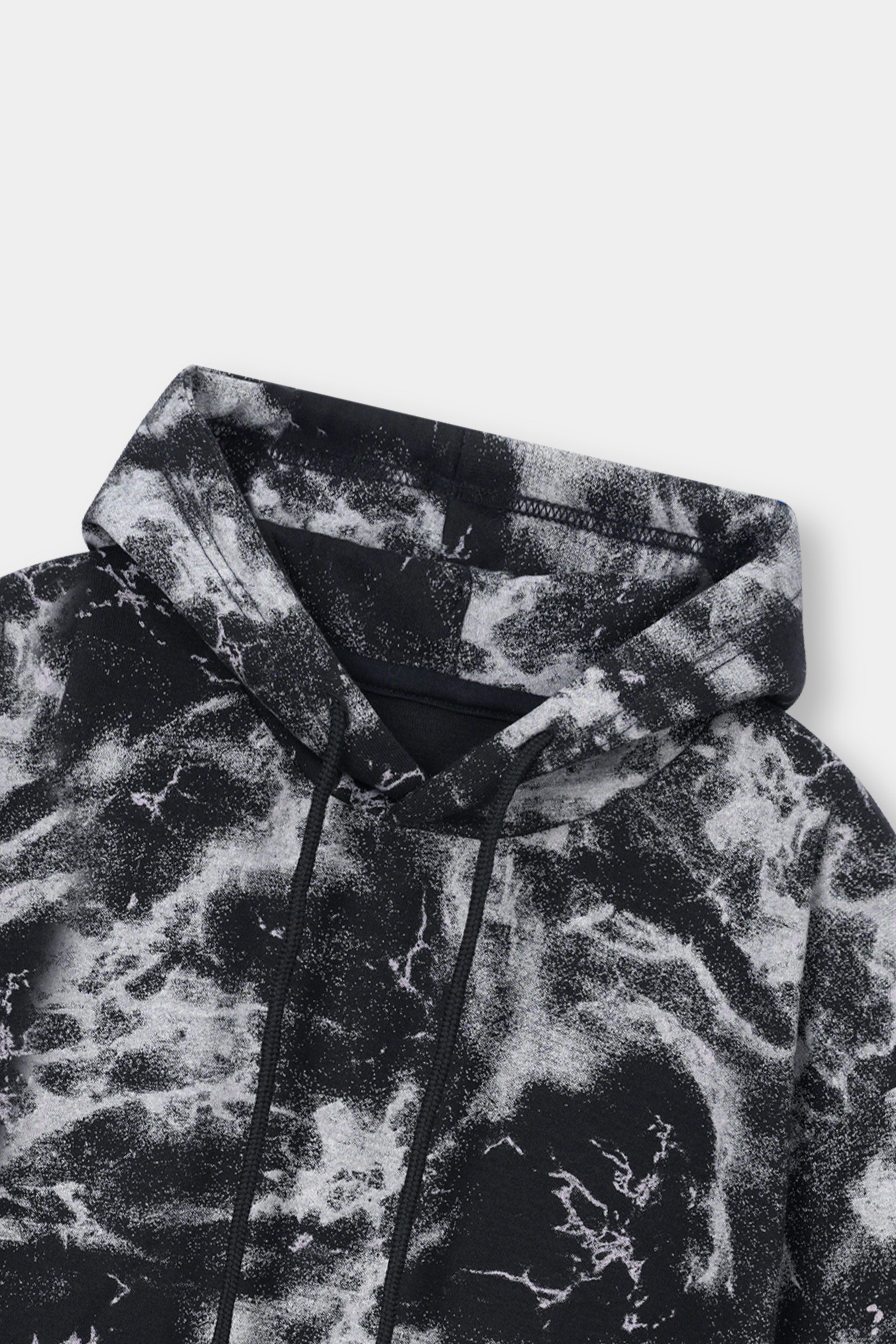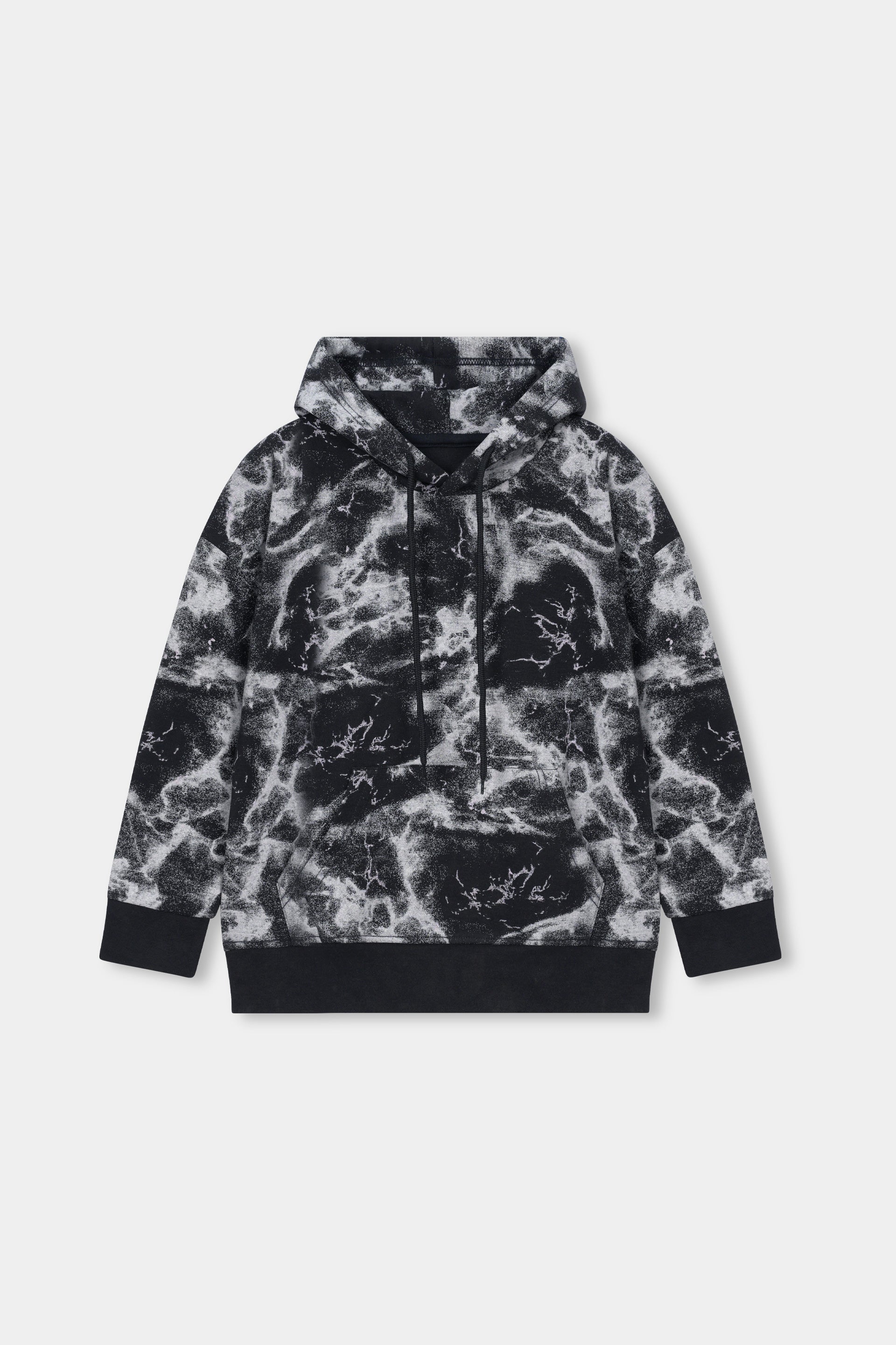 All-over black and white distressed print with a dynamic, marbleized or "cloud-wash" effect. The bold pattern ensures you're never boring, while the classic hoodie silhouette keeps you comfortable