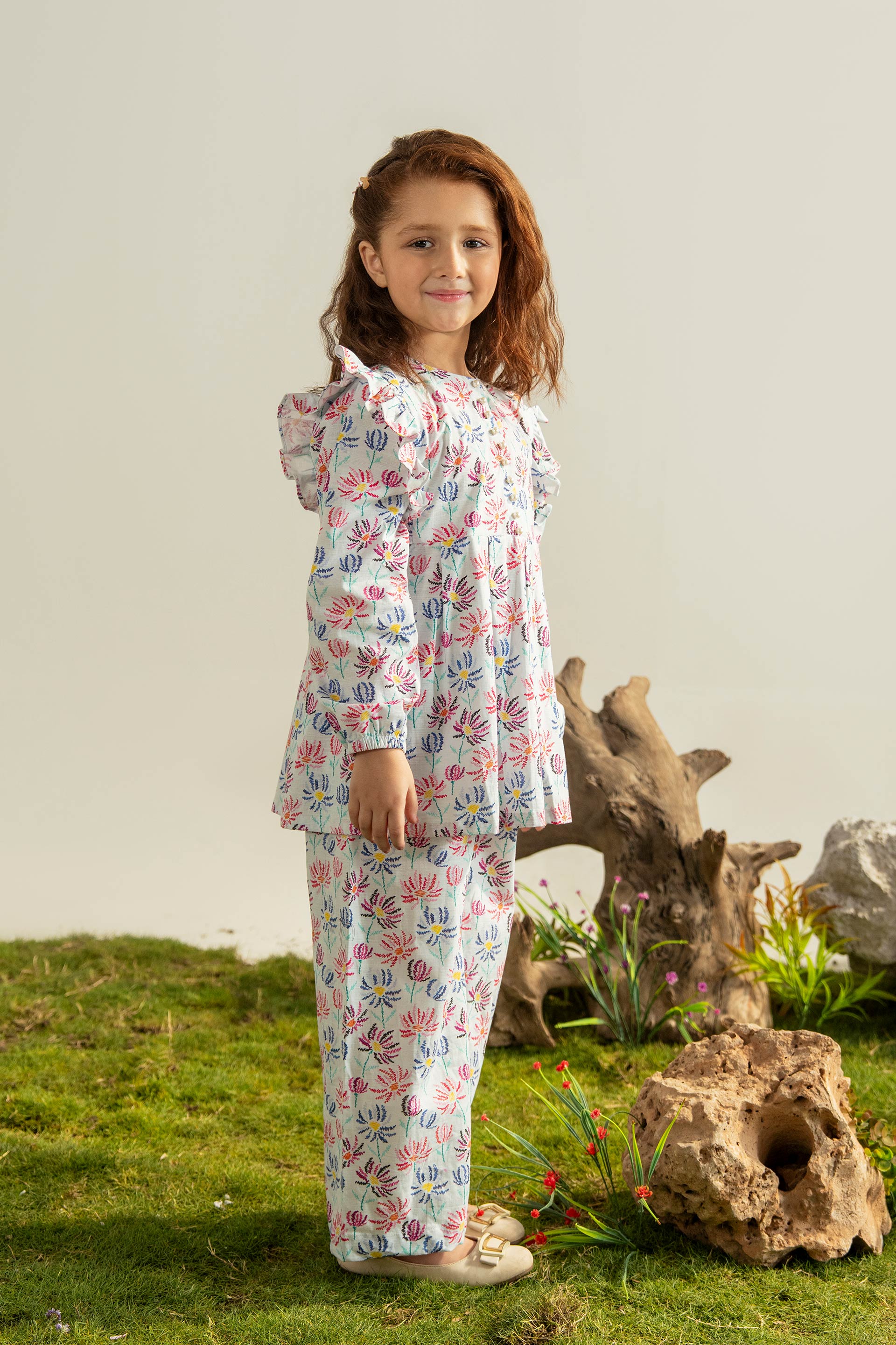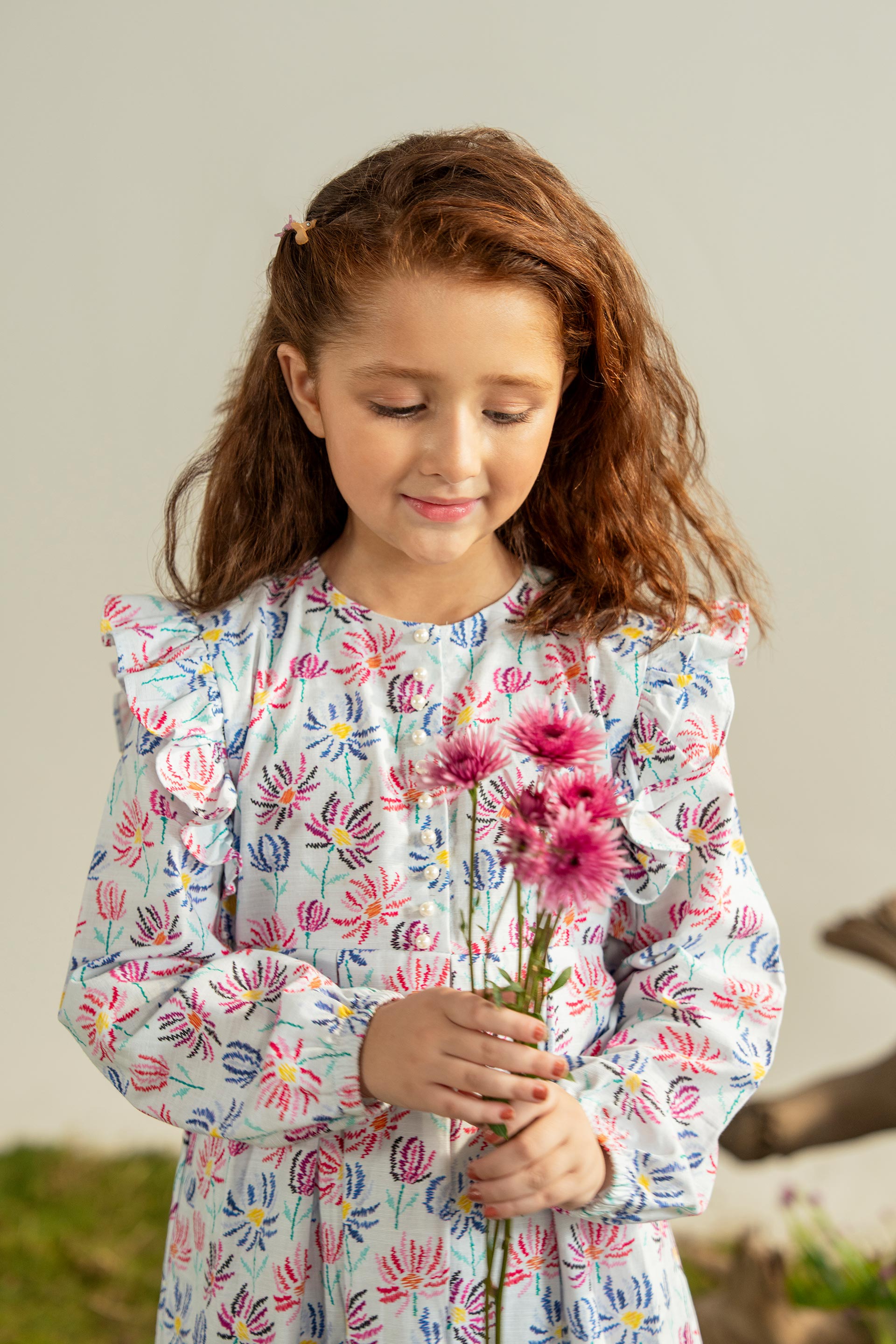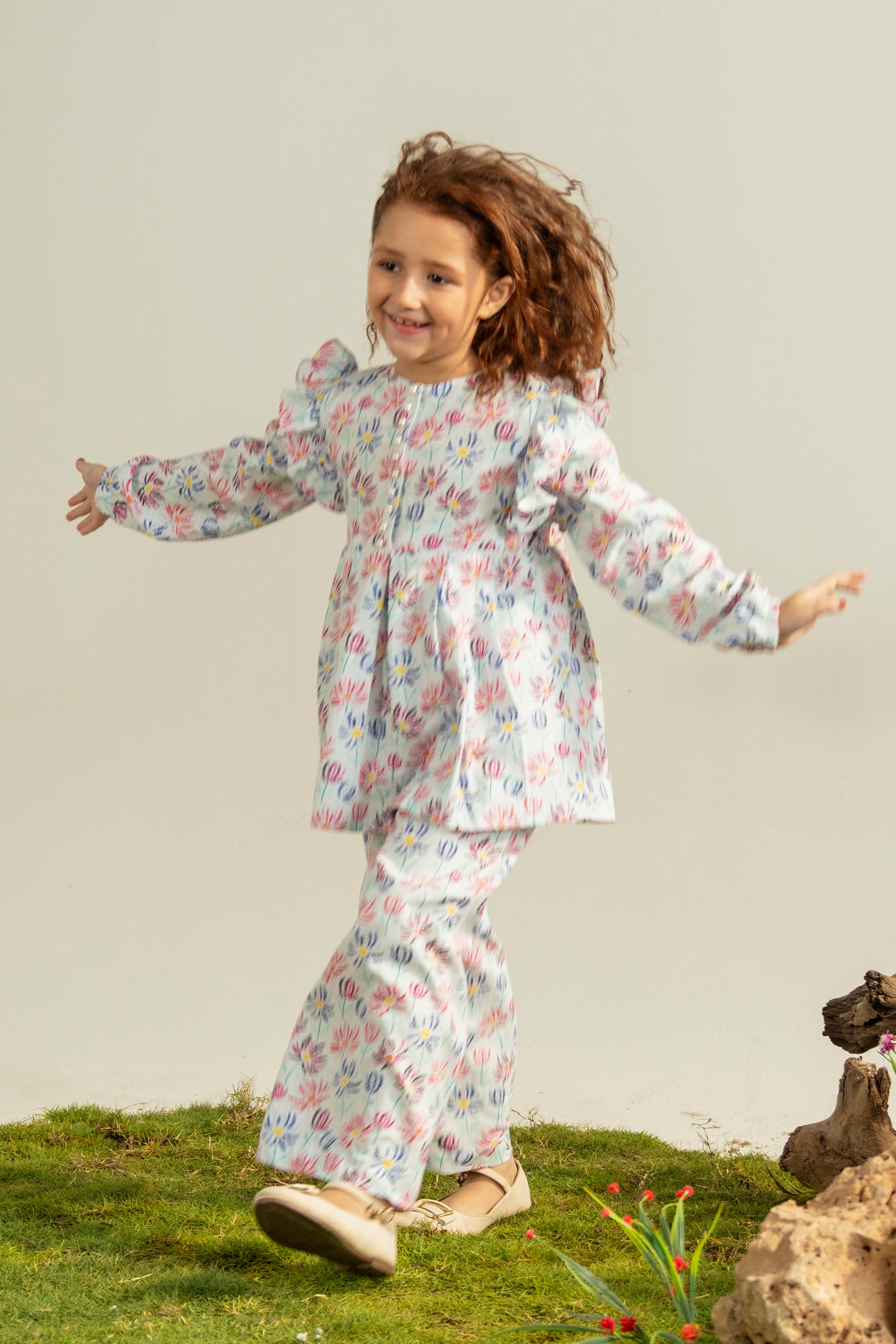 This charming suit, made from light and airy khaddar fabric, features a delicate multi-color print and sweet ruffle detailing on the kurta. A playful yet comfortable look perfect for your little one.
