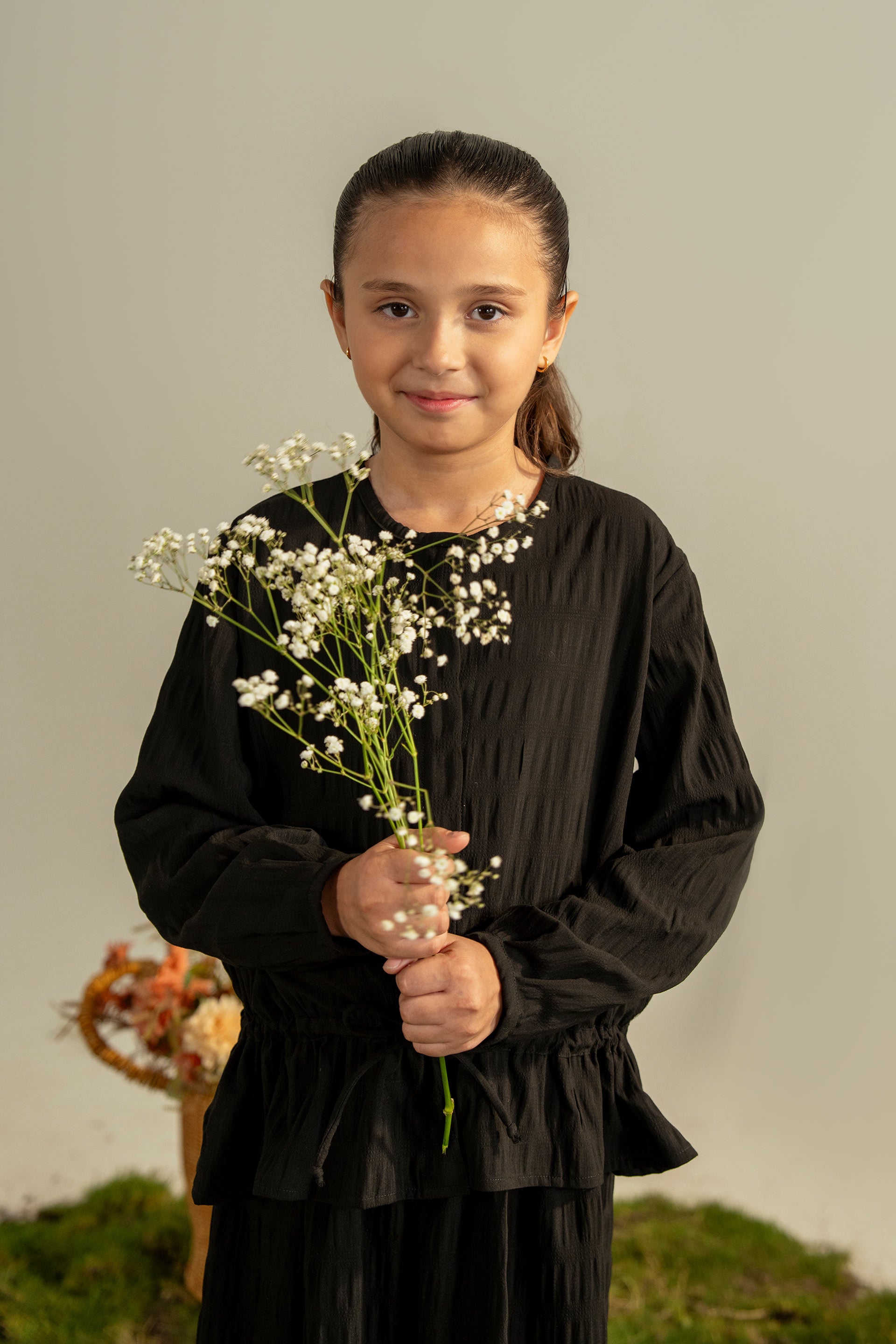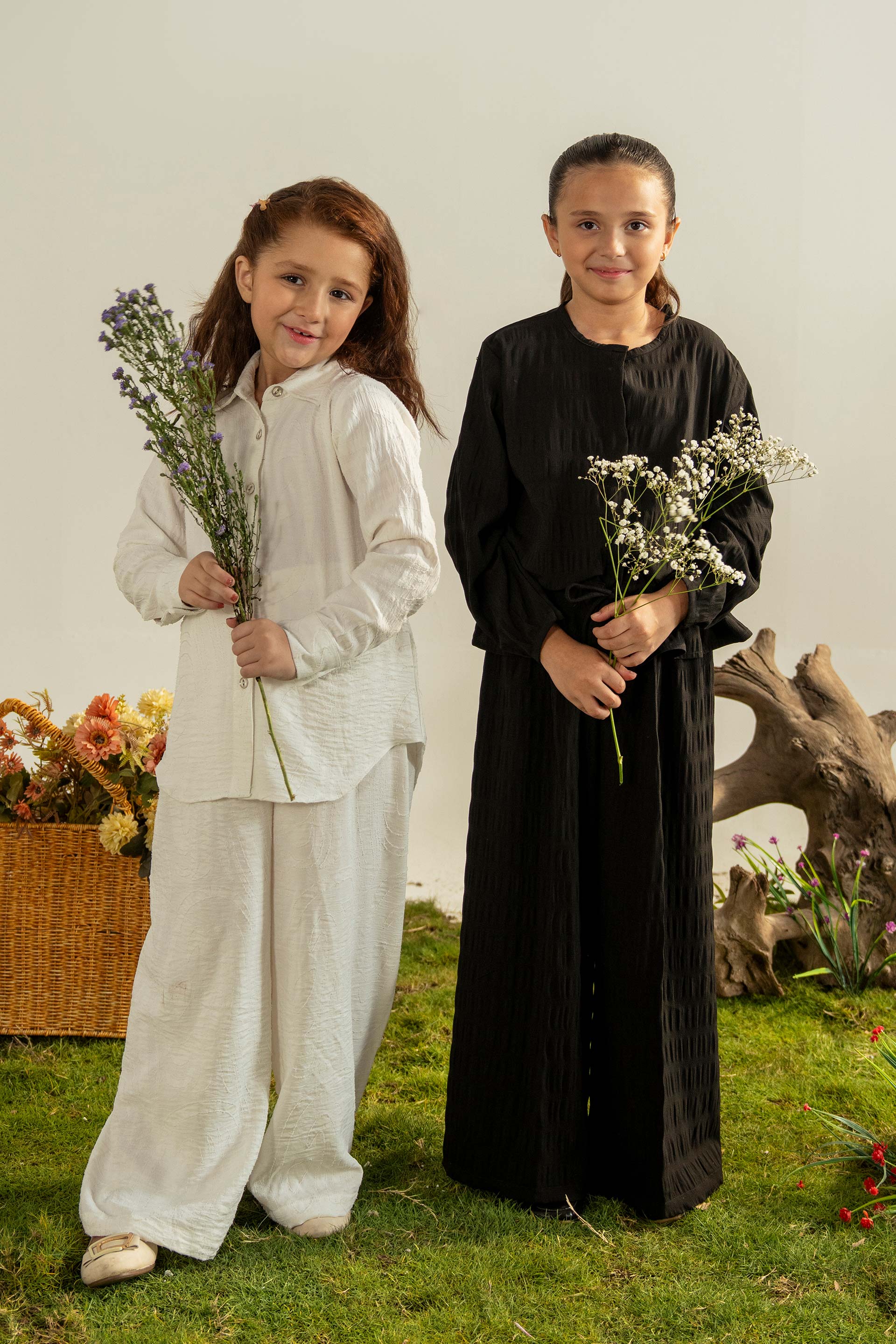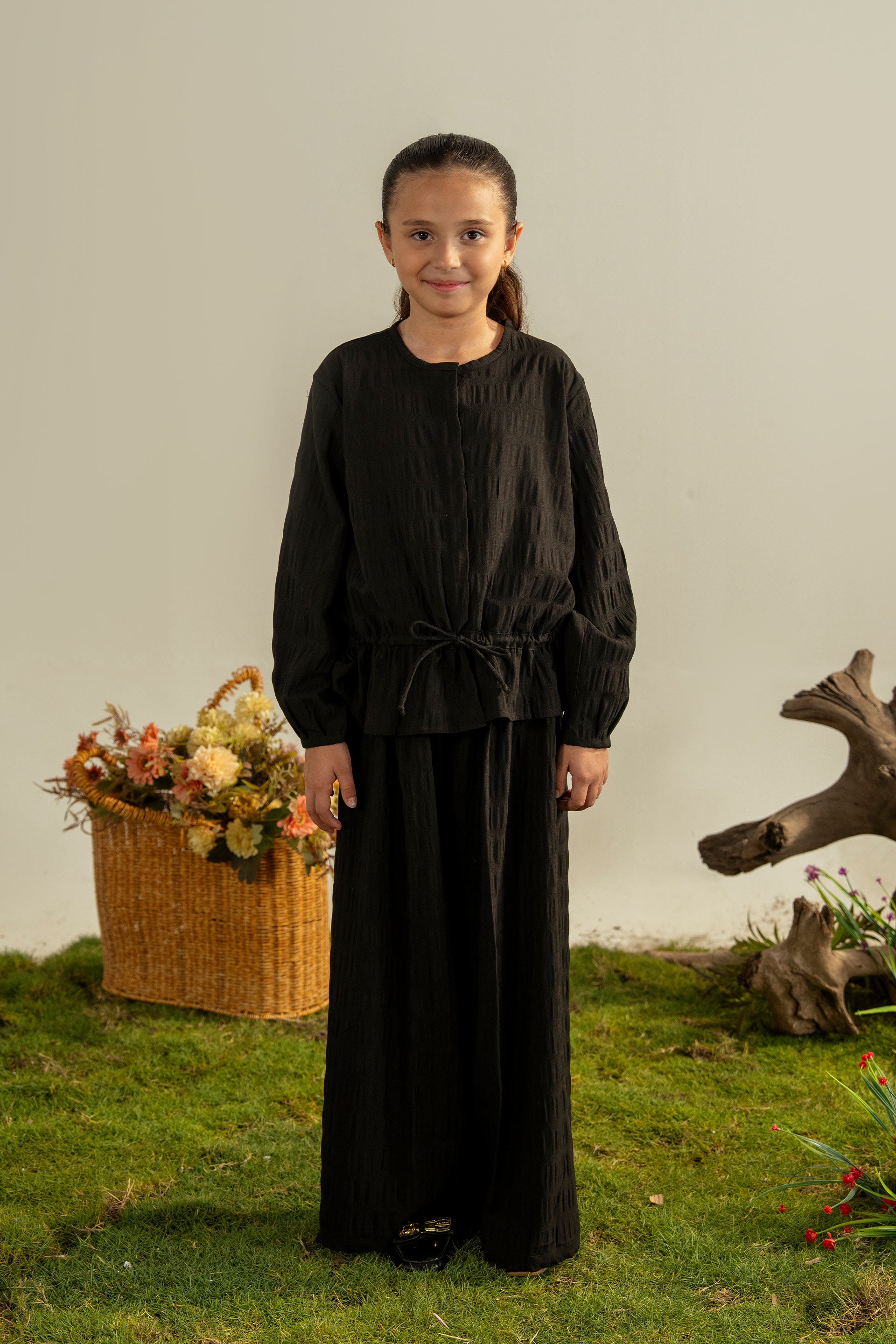 An effortlessly modest ensemble featuring a subtle textured black fabric with a comfy, loose silhouette.