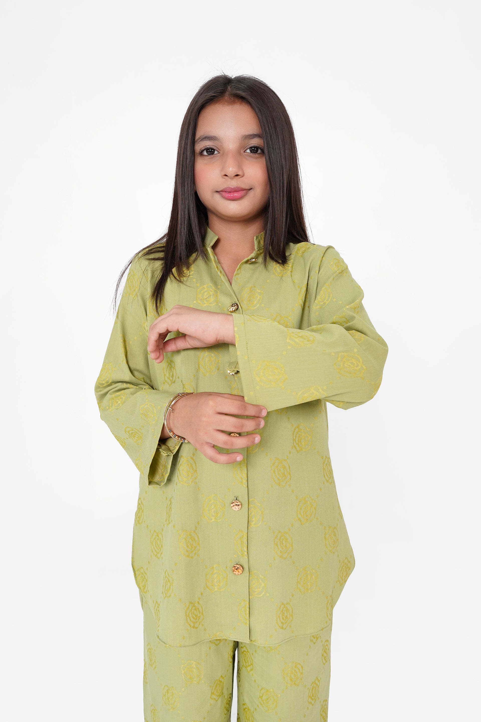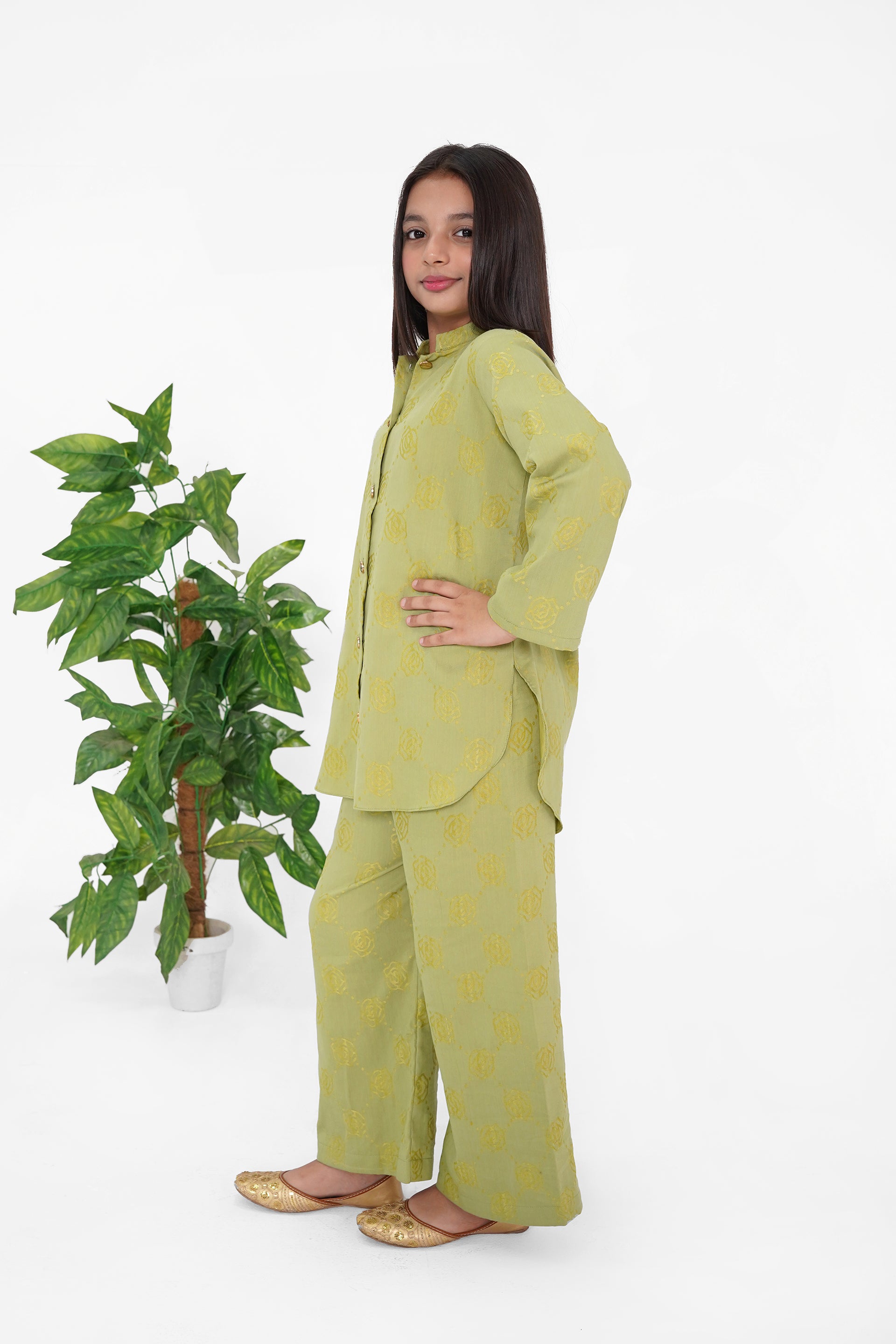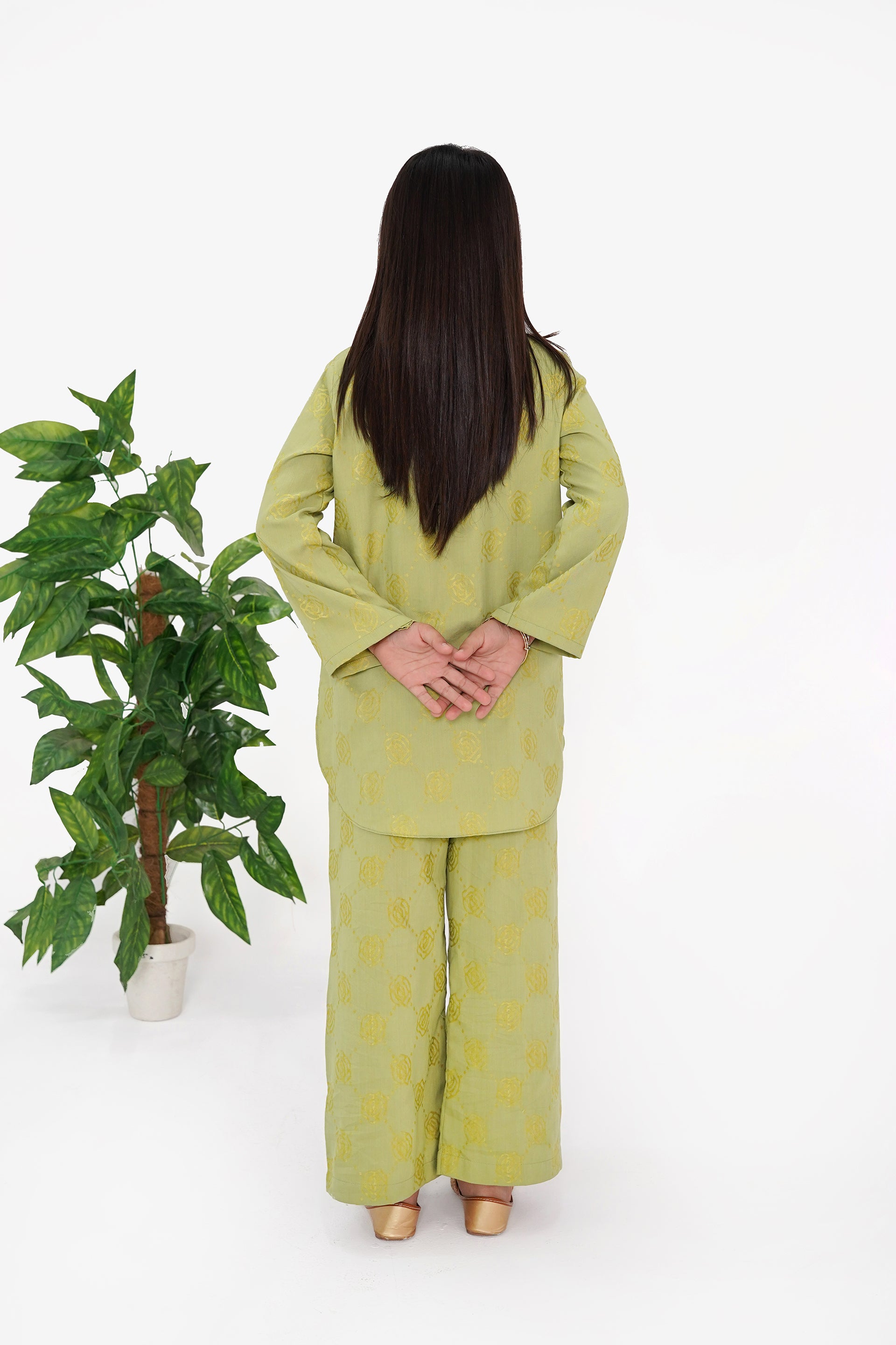 An effortlessly modest ensemble featuring a subtle Jacquard Light Green fabric with a comfy, loose silhouette.