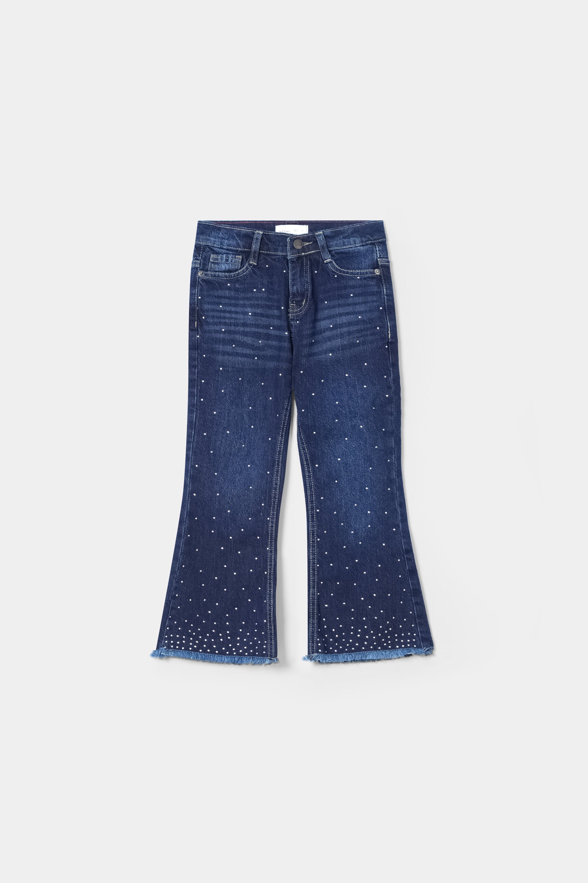 These dark-wash flare jeans feature dazzling crystal embellishments and frayed hems, blending vintage charm with a modern luxe edge for standout style.
