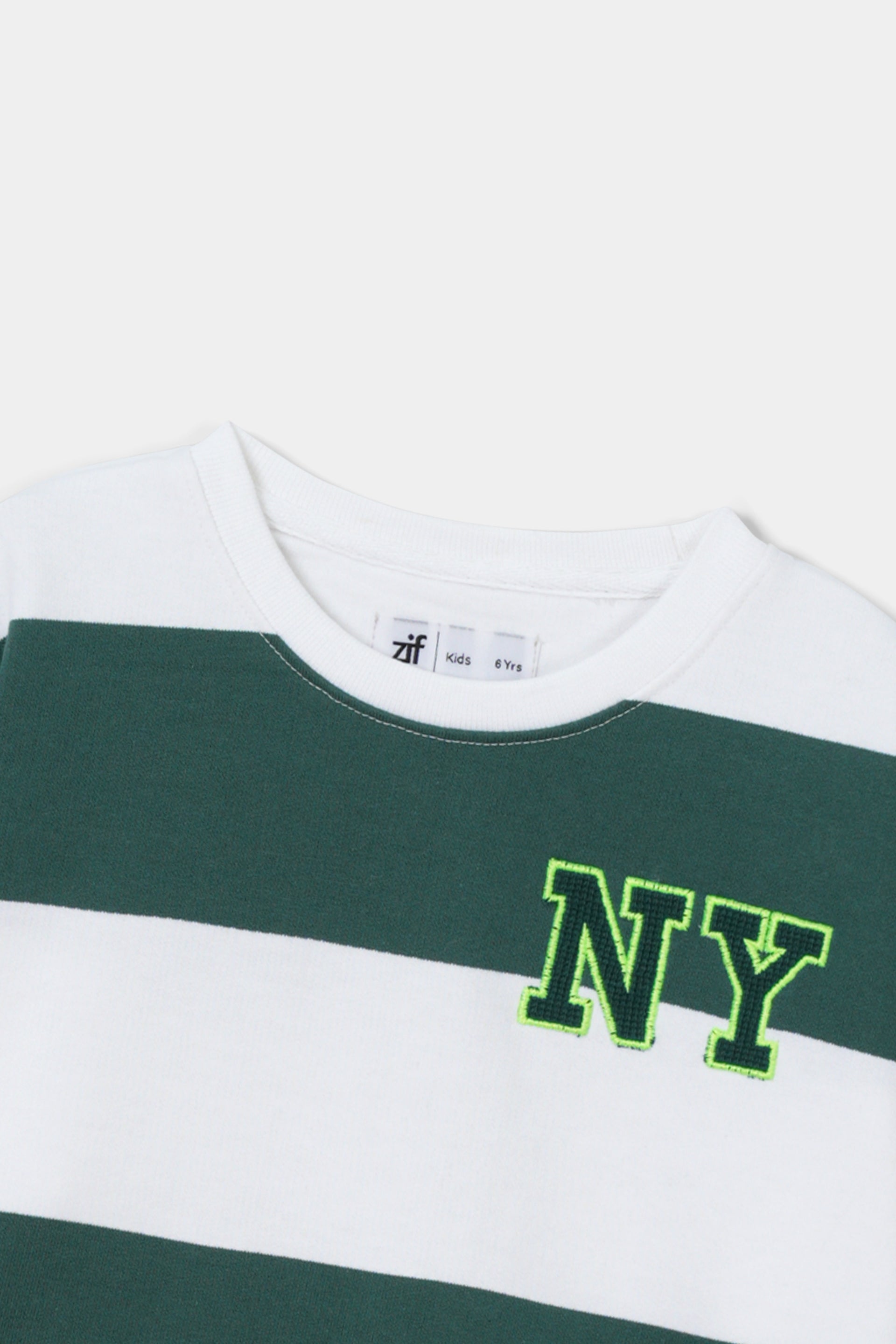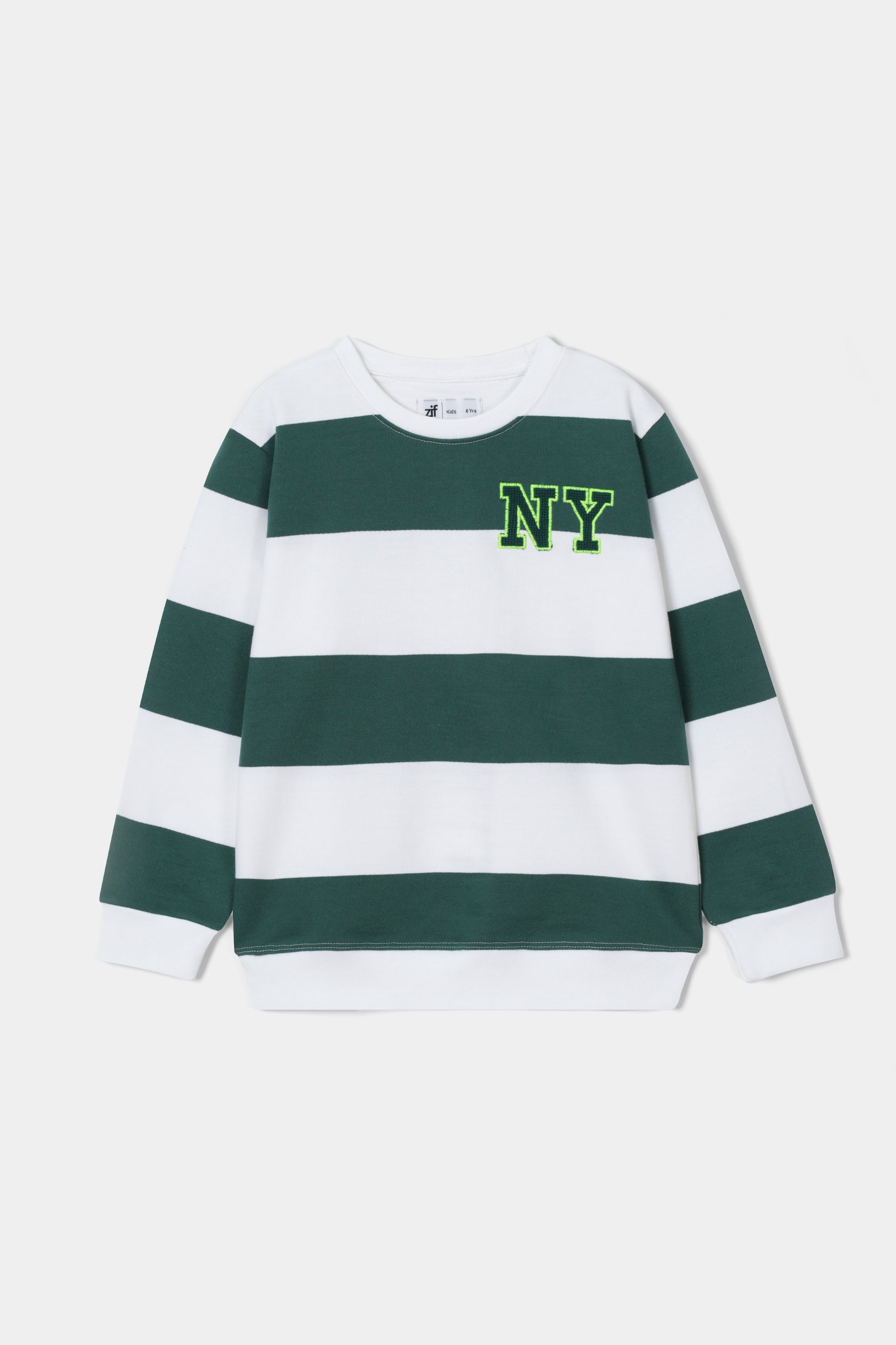 Varsity Patch: Detailed with a small, 'NY' chenille embroidered patch on the chest in neon green and dark green, adding an authentic collegiate touch.