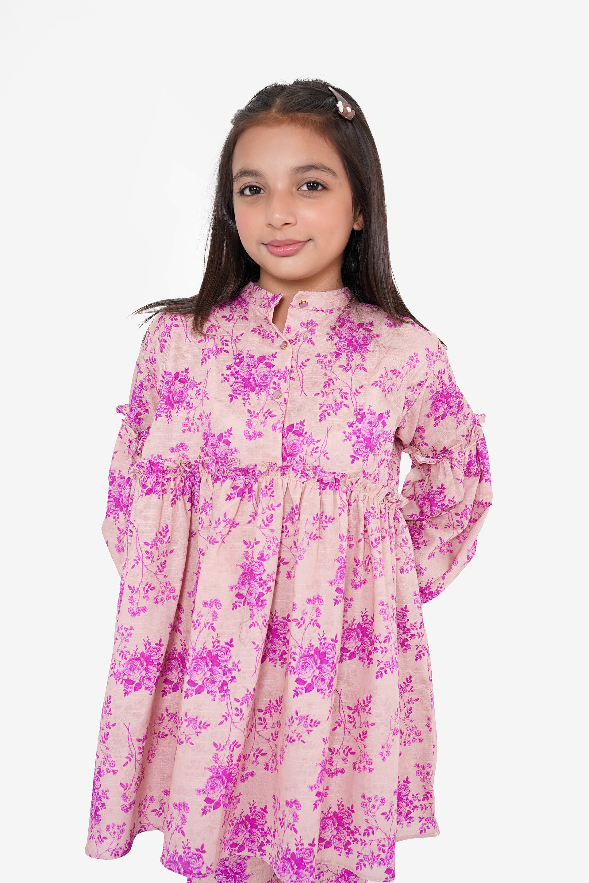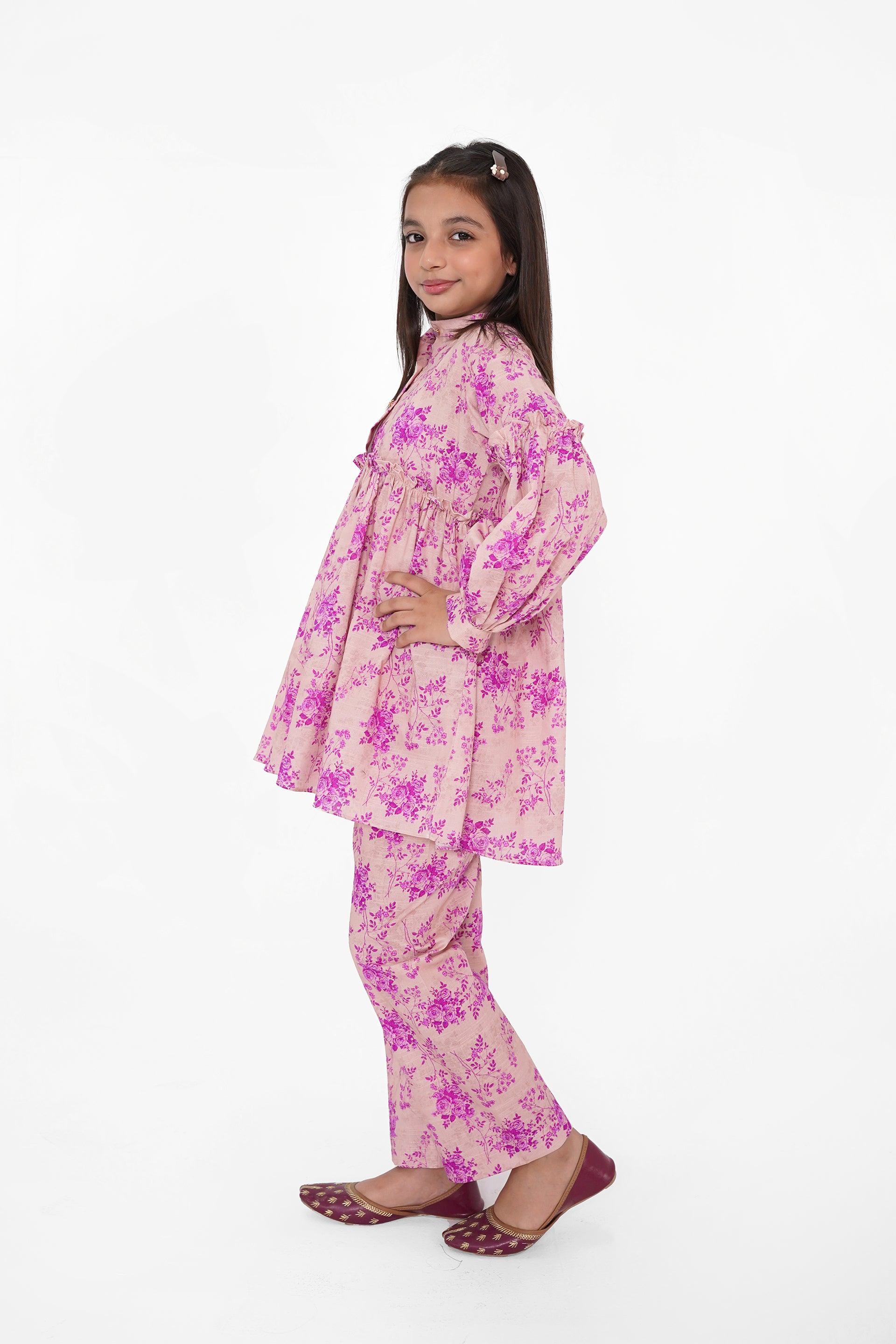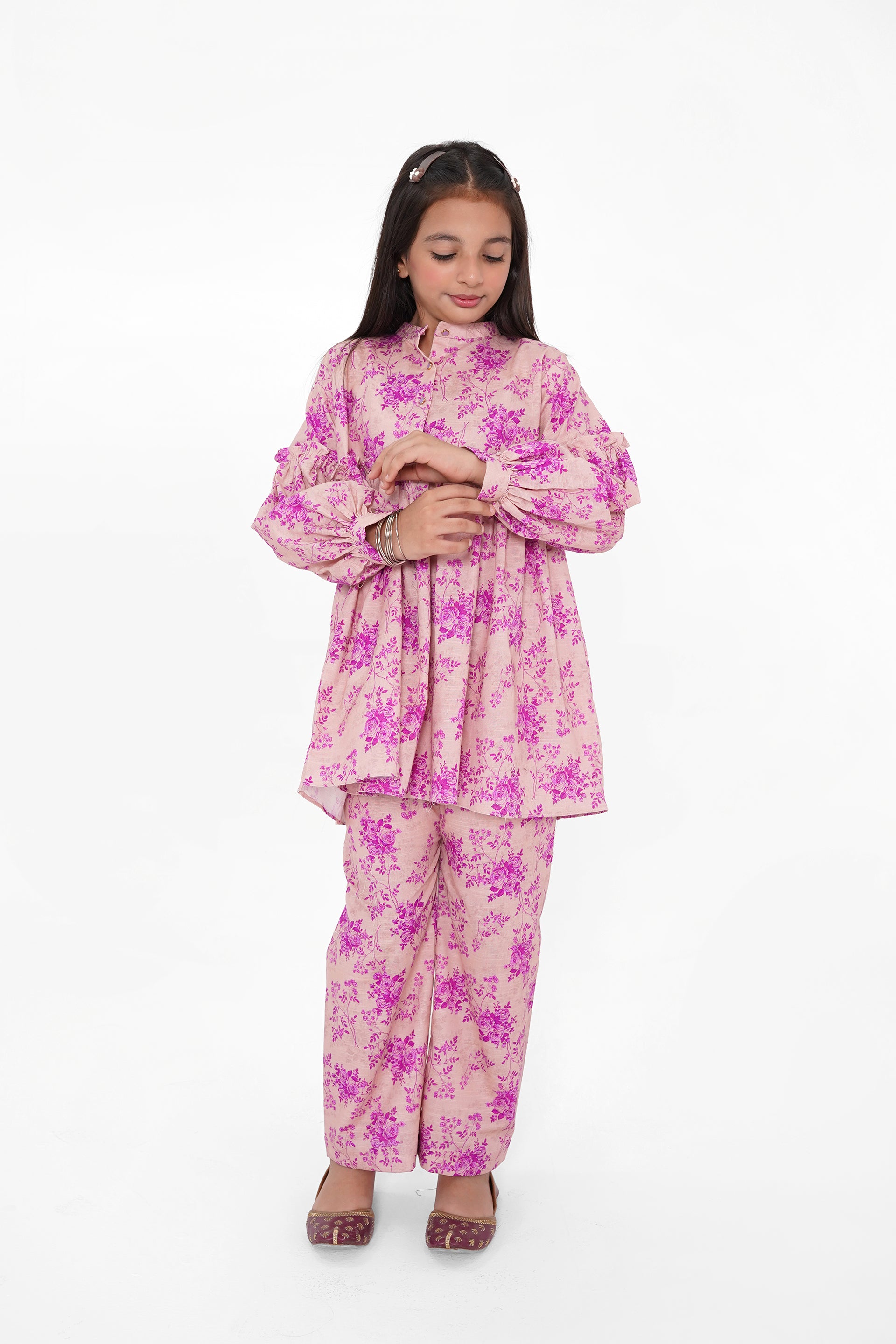 Ignite your winter wardrobe with this stunning printed Khaddar two-piece suit. Featuring vibrant Purple and floral prints, it offers Eastern luxury and comfort in one striking set