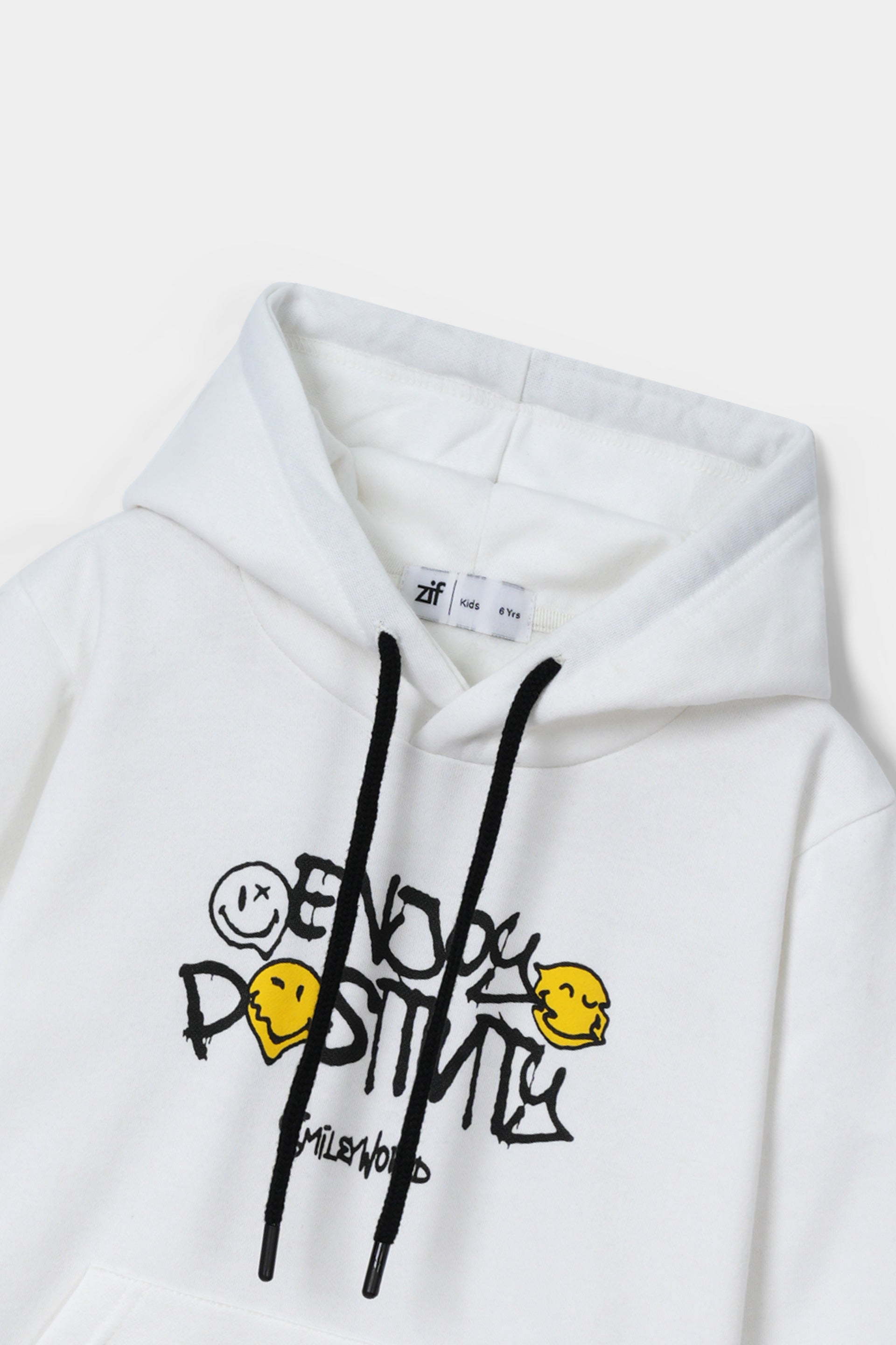 Bring some energy and attitude to their look with this standout white hooded sweatshirt. Featuring a bold, graffiti-style graphic and fun melting smiley faces