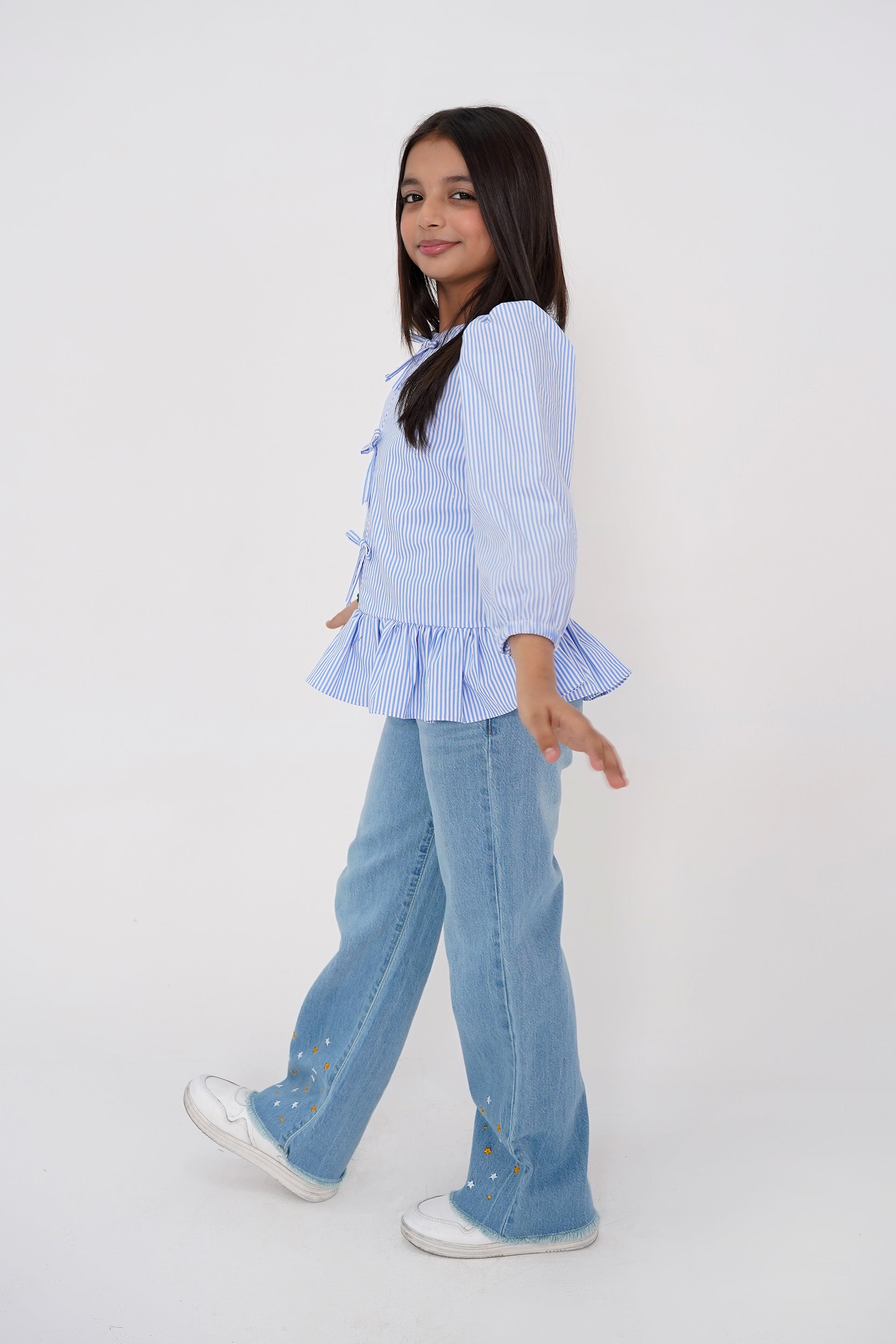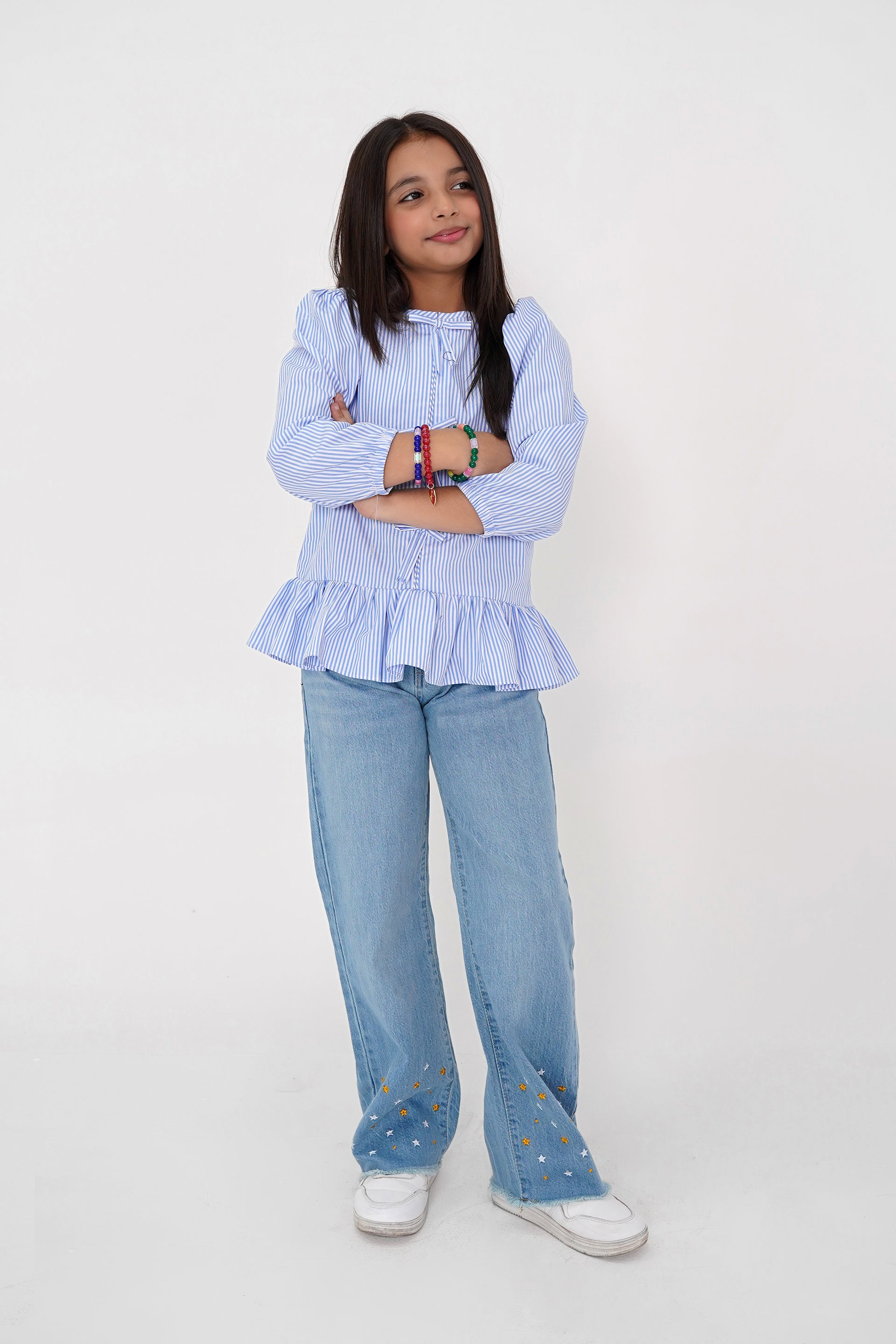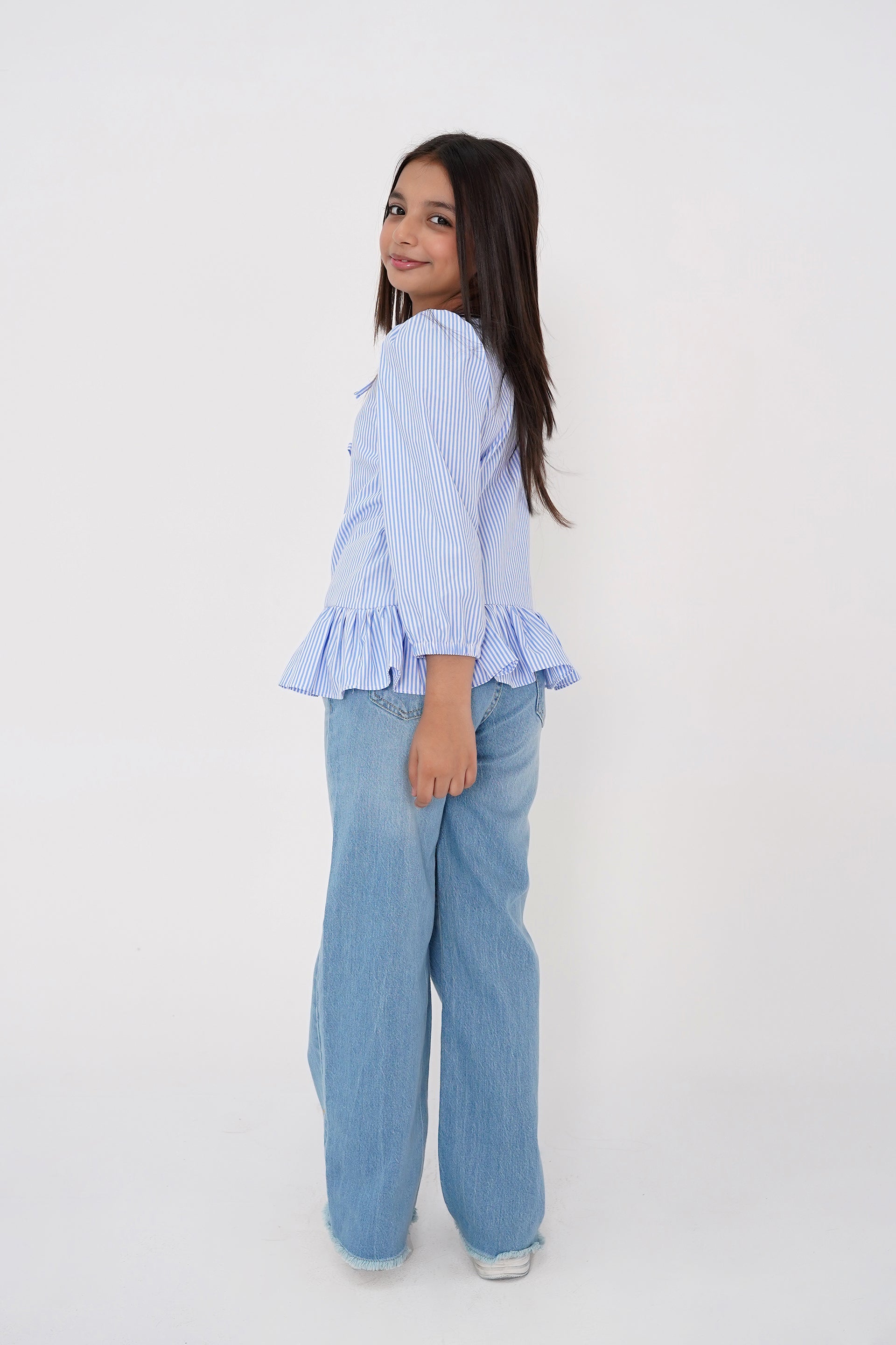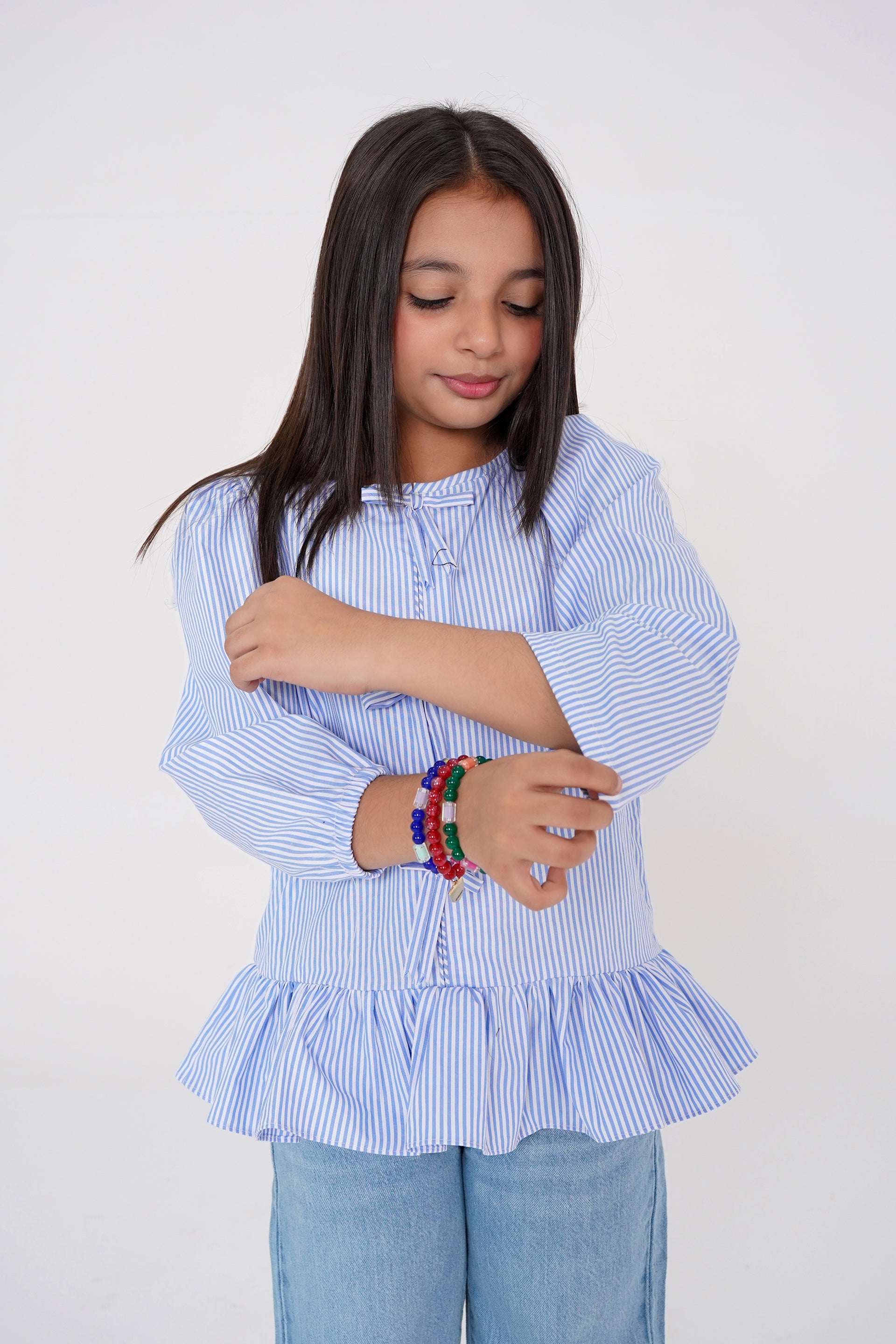 Achieve effortless, breezy sophistication with this light blue striped cotton shirt, which pairs classic vertical stripes with a feminine peplum hem for comfortable, everyday elegance.
