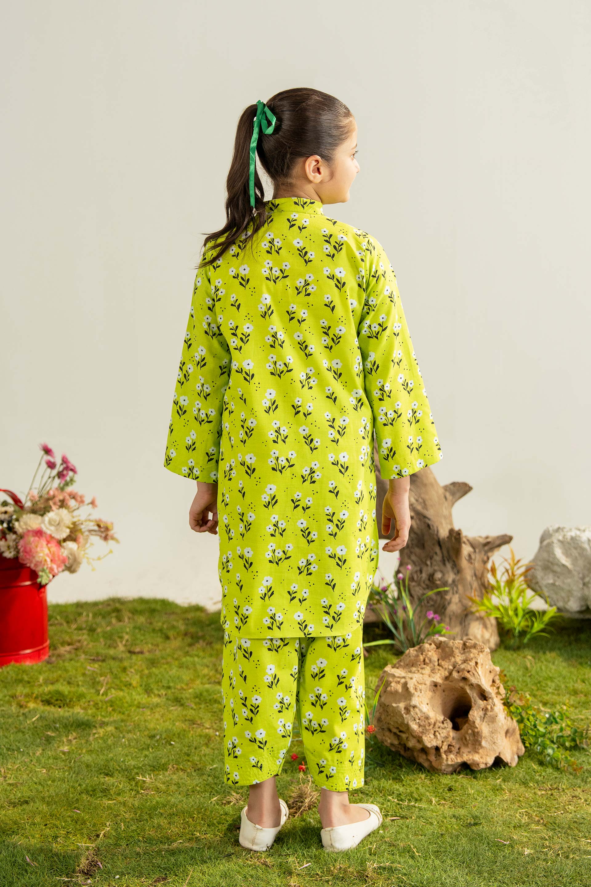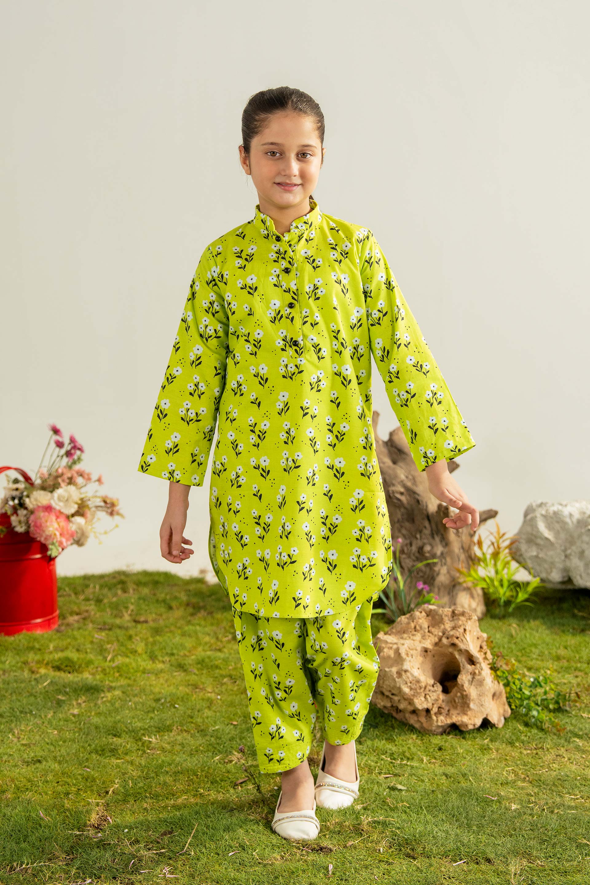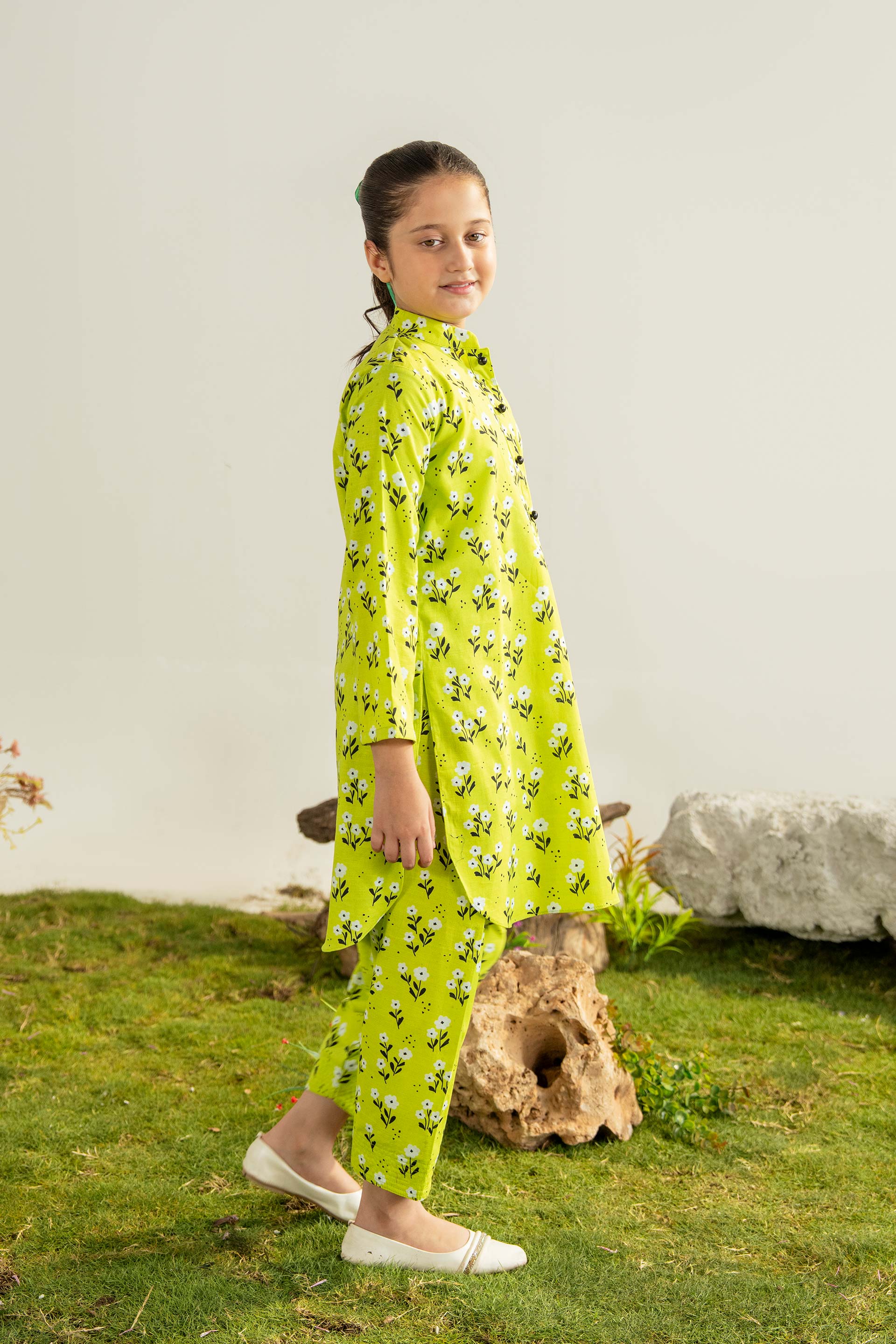 Dressed in vibrant lime green khaddar, this floral print kurta and shalwar set offers a comfortable yet chic look for young girls. Perfect for all-day wear, the breathable fabric ensures ease and style.