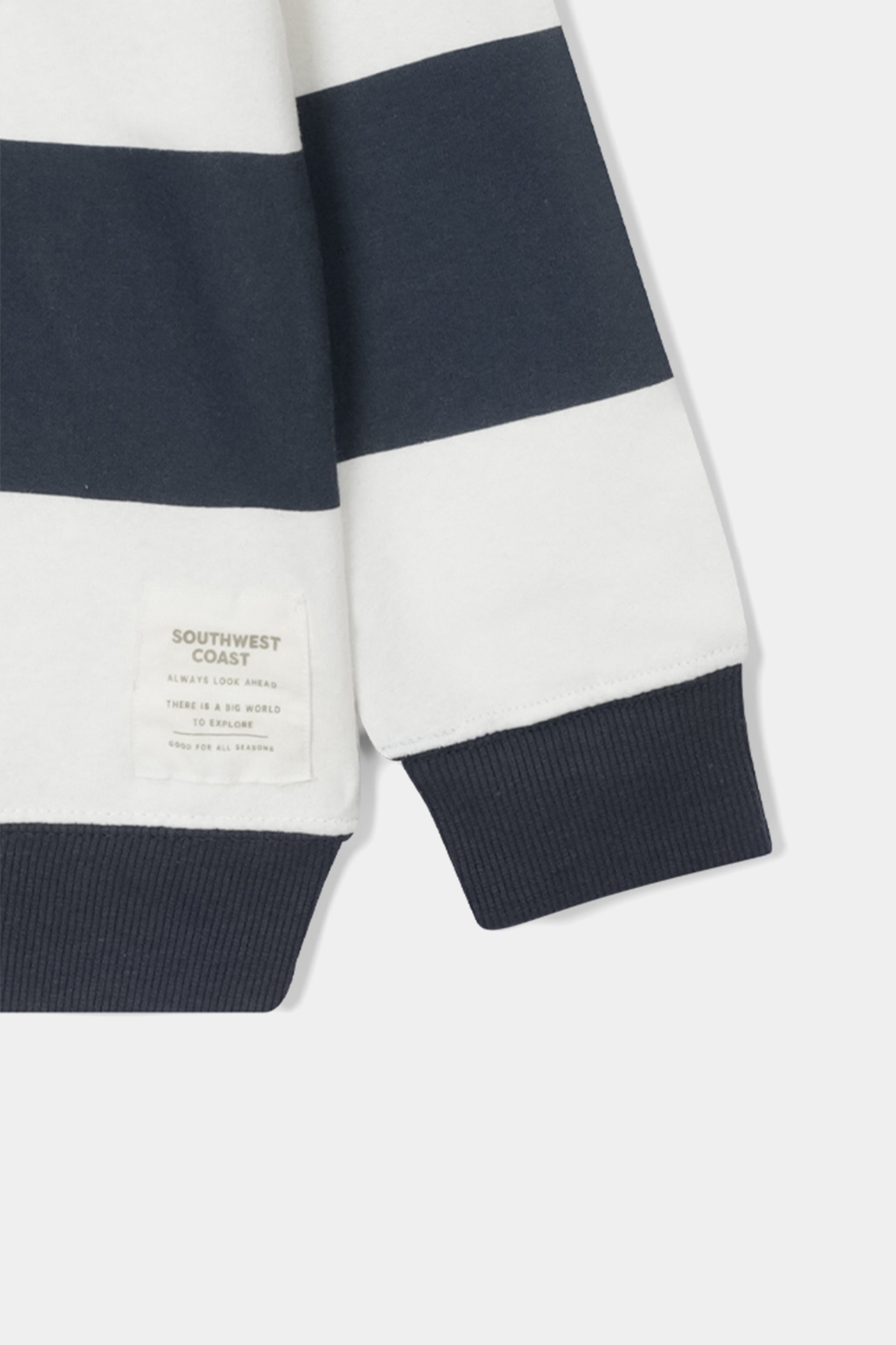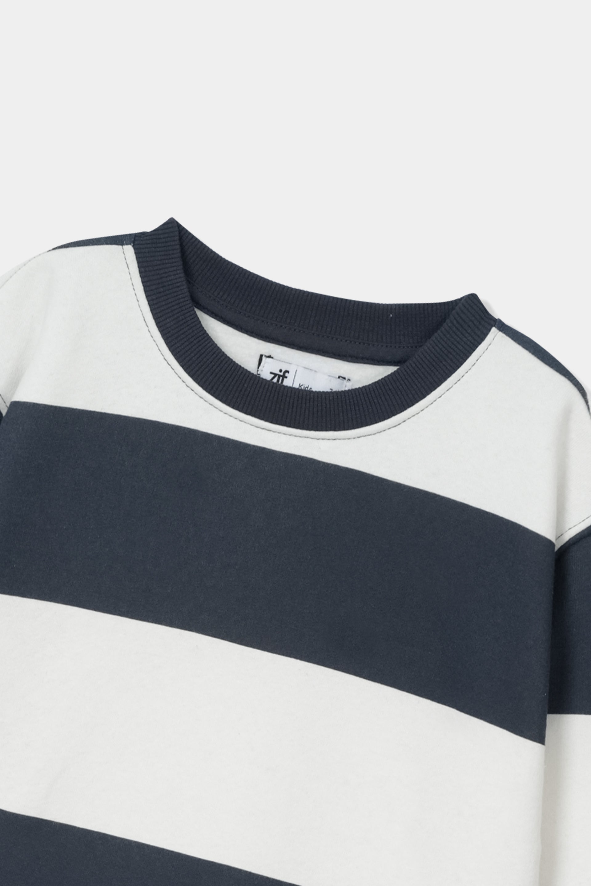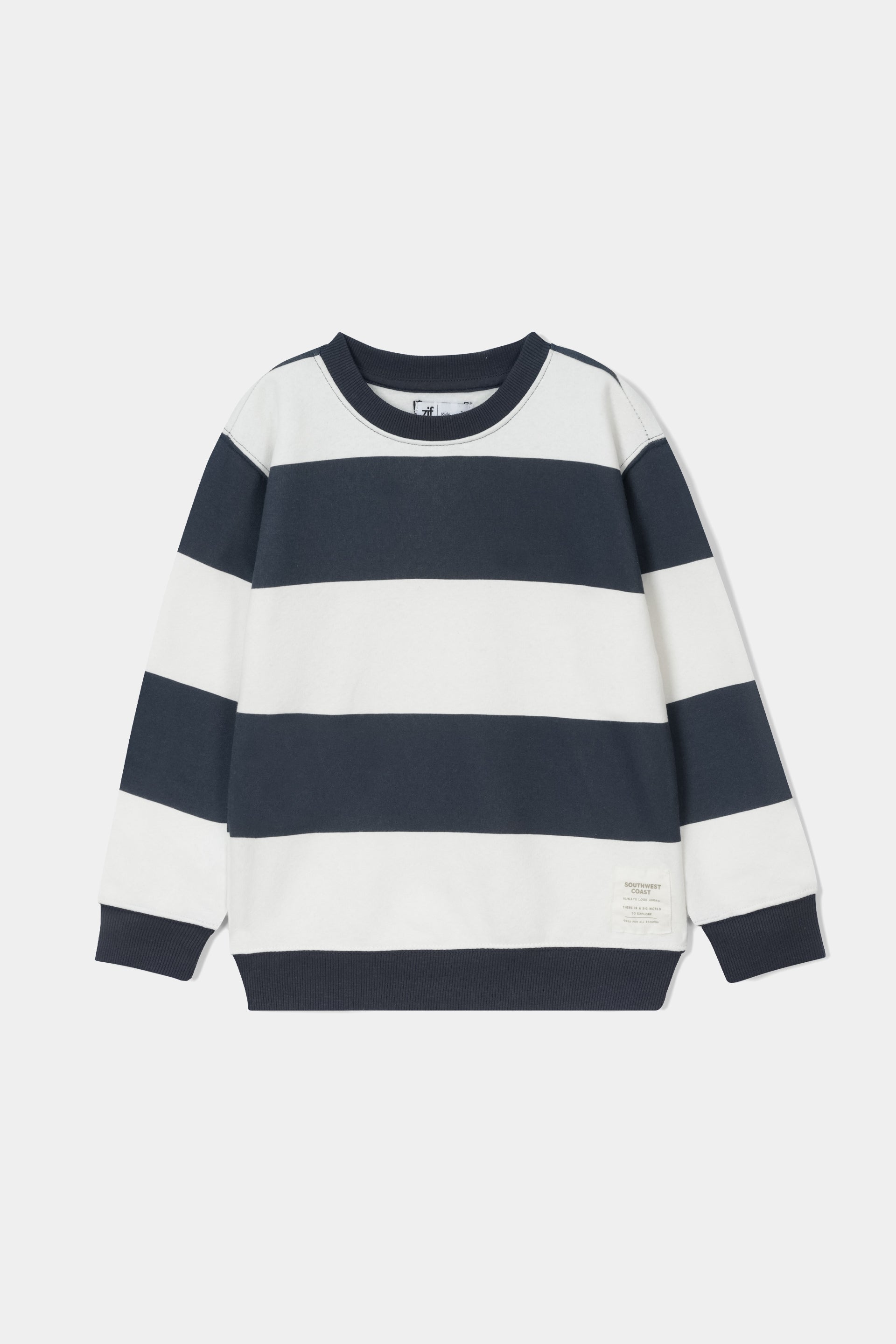 This crew neck sweatshirt features bold, horizontal stripes in a crisp Navy Blue and White (or Off-White). It strikes the perfect balance between casual comfort and preppy sophistication,