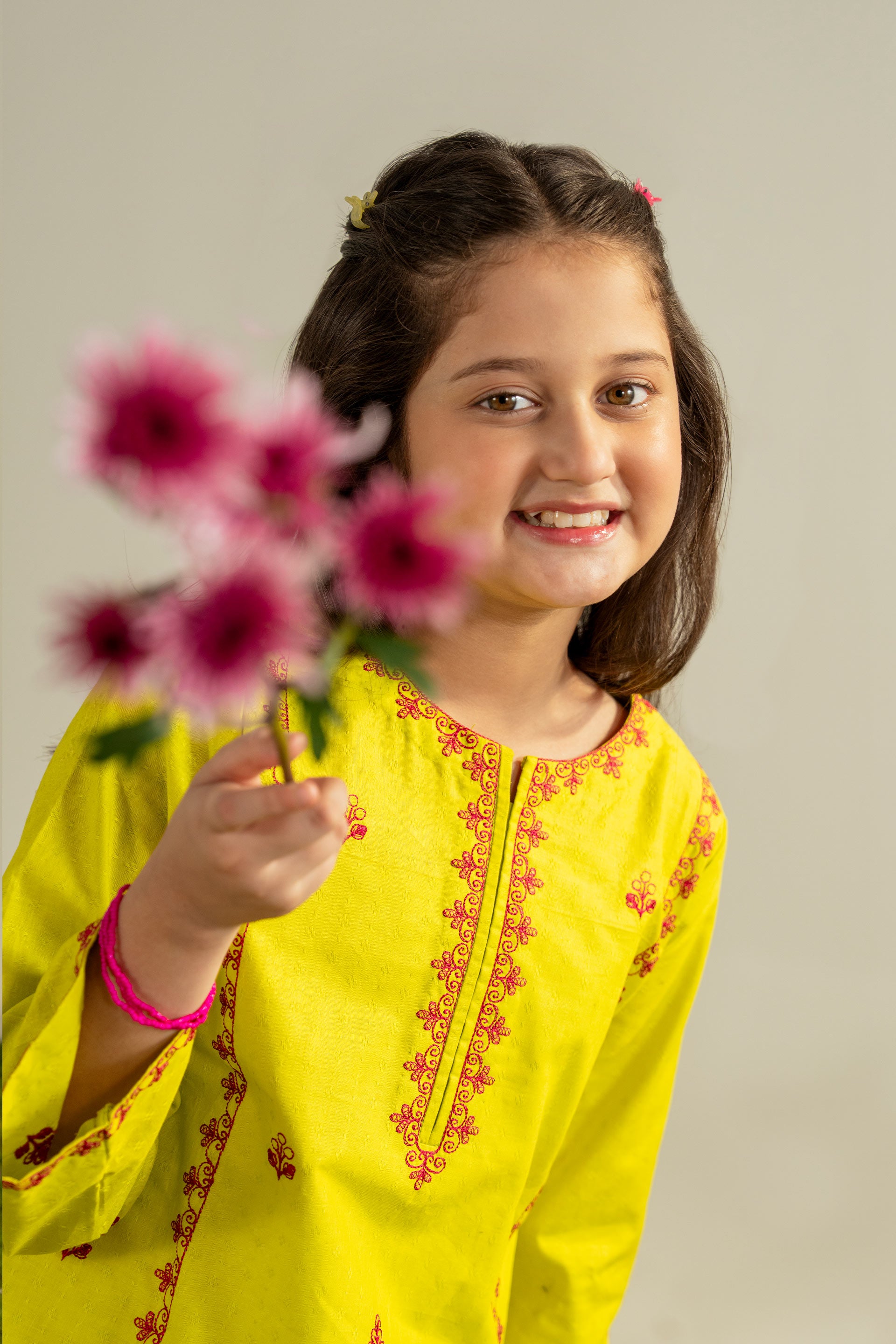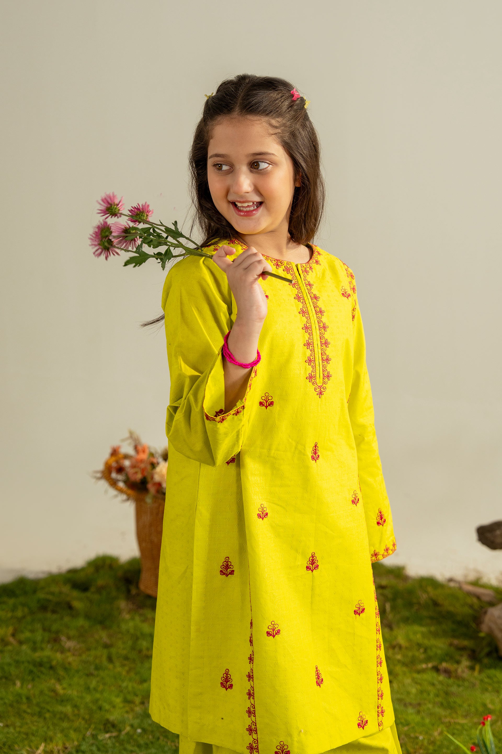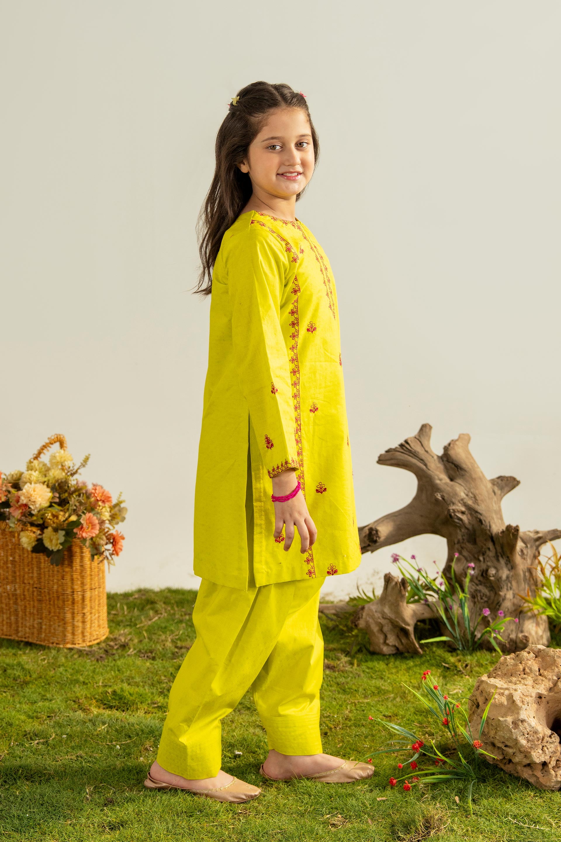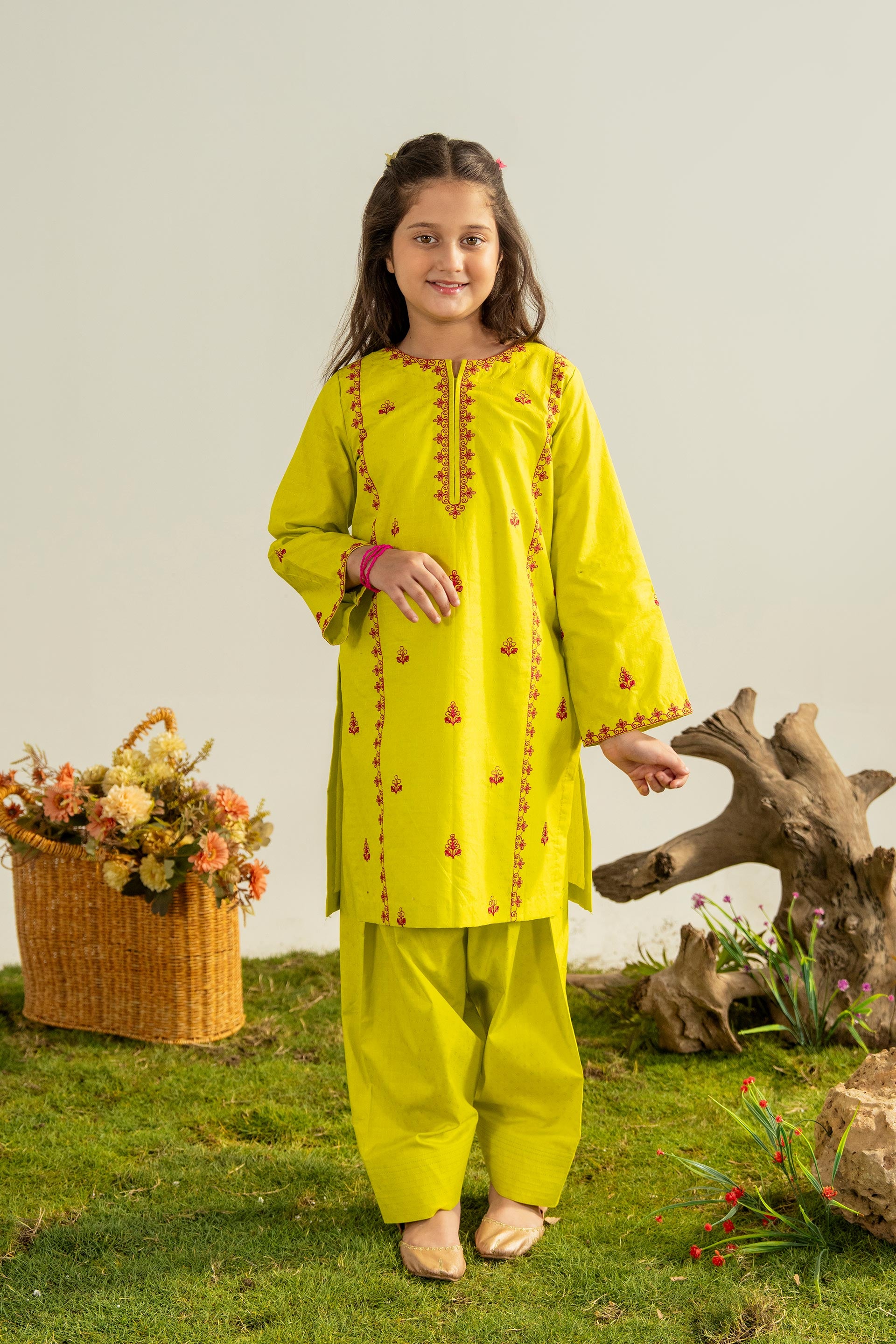 This bright, eye-catching lime green kurta and shalwar set features detailed, contrast embroidery along the neckline and body.